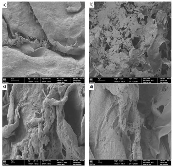 The first thermal degradation evidence was noticed from 60 to 100 °C in all thermograms due to water weight loss. Even after the drying processes in the ovens, adsorbed non-freezing [] water molecules may still exist. The second thermal degradation profile was noticed from 200 to 400 °C, with decomposition peaks of polymeric monomers at ≈220 °C (derivative curves). In this case, the total weight loss ranged from 12.62 to 21.04%. The maximum thermal degradation temperature (Tmax) was higher for CDBM as empty volumes available in hydrogel networks are occupied by solute molecules, hindering the water diffusion though pores []. Lower total weight losses were determined for the CPBM and CDBM samples as there are strong intermolecular interactions between MB and hydrogel during the active site occupation of the biomaterial networks, corroborating the SEM results presented below.