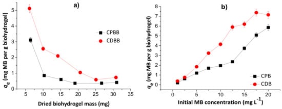 Effects of dried hydrogel mass (a) and initial MB concentration (b) during adsorption studies to chitosan/pectin blend hydrogel (CPB) and chitosan/DNA blend hydrogel (CDB). Experimental conditions: initial MB concentration of 10.0 mg L−1 (Figure 7a), dried hydrogel mass of 10.0 mg (Figure 7b), temperatures of 25 °C and adsorption times of 24 h.