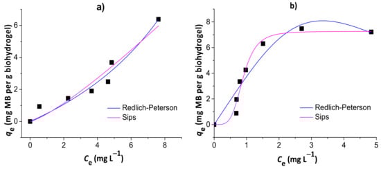 Figure 8 shows the results of nonlinear Redlich–Peterson and Sips isotherm models for the adsorption of MB to the chitosan/pectin (a) and chitosan/DNA (b) blend hydrogels. Other isotherm model equations, such as Langmuir and Freundlich equations, were used without success to evaluate alternative mechanisms (data not shown). The isotherm parameters are summarized in Table 3.