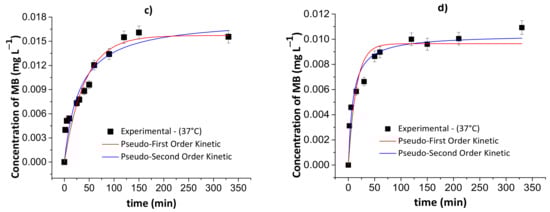 The best kinetic model that fits the MB release was defined by assessing the following parameters: R2, χ2 and AIC. The AIC statistical parameter is commonly employed to confirm if the experimental results fit the theoretical model. Overall, the pseudo-first-order kinetic model is the most appropriate to explain the MB release process when there is a low MB concentration inside the polymer network. On the contrary, the pseudo-second-order kinetic model demonstrated to be more appropriate when there is high MB concentration inside the polymer network []. At high MB concentration inside the polymer network, the occurrence of chemisorption between MB and the hydrogel, affecting desorption/release process, was observed. This effect is associated with the rearrangement of the hydrogel chains after MB interactions with active adsorption sites.