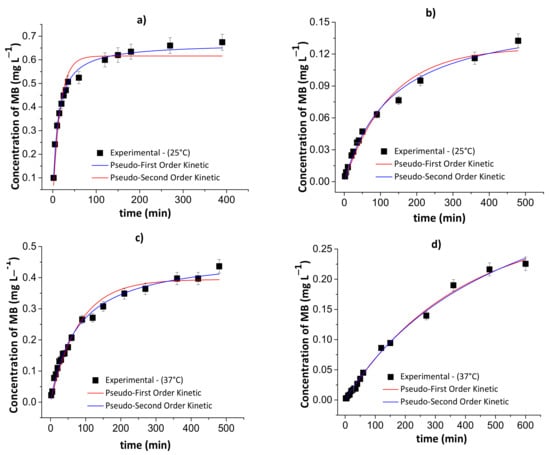 The MB adsorption capacities decreased with the increase of the hydrogel mass, inferring that the prepared biomaterials first absorb water, and subsequently dye. Therefore, the dye adsorption phenomenon takes place by partition, and depends on the water diffusion mechanism []. The highest loading values are equal to 5.1 and 3.1 mg g−1, for CDB and CPB, respectively, in agreement with the TG and SEM analysis. However, at 10.0 mg, the loading capacity values are still acceptable. Posterior experiments were performed with 10.0 mg of dried hydrogel to minimize errors and evaluate the possible scale increase. The increase in the initial MB concentration increased the adsorption capacity due to higher amount of dye diffused into the biopolymeric network. These values started to stabilize from 17.5 and 20.0 mg L−1 during adsorption to the chitosan/DNA and chitosan/pectin hydrogel, respectively, due to saturation of the active adsorption sites in the hydrophilic three-dimensional structures. Overall, the initial MB concentrations ranging from 17.5 to 20.0 mg L−1 are suitable for MB loading in both hydrogels.