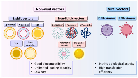 Viral and non-viral carriers of nucleic acids. NLC: nanostructured lipid carrier, SLN: solid lipid nanoparticles, CP: cell penetrating, NPs: nanoparticles.