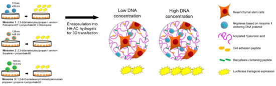 - Villate-Beitia, I.; Truong, N.F.; Gallego, I.; Zárate, J.; Puras, G.; Pedraz, J.L.; Segura, T. Hyaluronic acid hydrogel scaffolds loaded with cationic niosomes for efficient non-viral gene delivery. RSC Adv. 2018, 8, 31934–31942. [Google Scholar] [CrossRef] [PubMed]