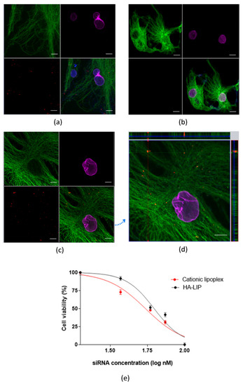 Figure 2e). The treatment using HA-LIP induced a lower decrease in the metabolic activity of ARPE-19 cells, compared with cationic lipoplex, especially at 40 nM, which was statistically significant. This difference in cell viability may be due to one of HA’s numerous biological functions, which include the promotion of cell proliferation, migration and intracellular signaling [