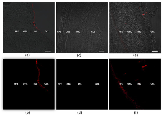 For the retinal distribution study, the animals were divided into 2 groups, according to the lipoplex formulation. In the first group (n = 4), 5 μL of cationic lipoplex containing rhodamine-labelled siRNA was administered through intravitreal injections in the left eye. Similarly, the second group of animals (n = 4) received 5 μL of HA-LIP containing rhodamine-labelled siRNA by intravitreal injection. The contralateral eye in both groups served as a control and was injected with 5 μL of lipoplex containing control siRNA without fluorescence. Three hours after the intravitreal injections, the rats in this study were euthanized. Their eyes were enucleated and fixed immediately with a 4% paraformaldehyde solution (PFA). On the next day, these samples were washed with PBS and incubated with a sucrose solution in PBS at room temperature before inclusion in the Optimal cutting temperature compound (OCT) compound. Next, the eyes were frozen and immediately stored at −70 °C until sectioning. The 10 µm cryo-sections were prepared by using a cryostat (LeicaCM3050S, Nussloch, Germany). The Zeiss LSM 5 Live (Carl Zeiss, Oberkochen, Germany) confocal microscope was used to obtain the images of retinal tissues.