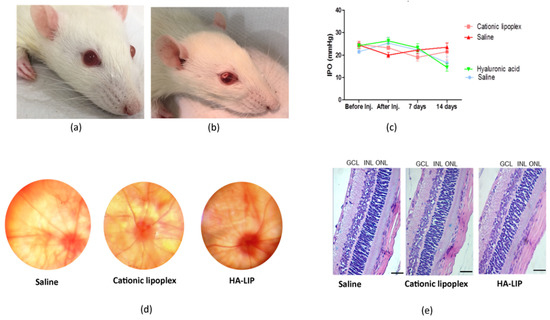 39]. Based on this, despite the IOP variations found in this animal group, these eyes had their main values in the normal range of rat IOPs (16.5 ± 5.4 for saline and 14.5 ± 3.4 for HA-LIP). Moreover, these authors reported that false IOP readings could occur after touching the eyelid or lacrimal meniscus, and because of the anesthesia. Since the contralateral eyes showed similar results at the same time of the experiment, the lower intraocular pressure may not be related to the toxic effect of lipoplex. Furthermore, the histological results did not show significant changes between the eyes that received lipoplex formulations and saline (