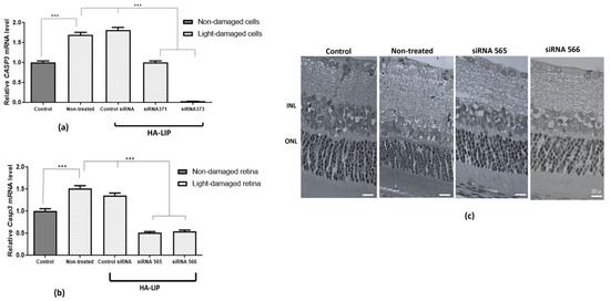 Figure 6c). The improved retinal morphology found after in vivo HA-LIP treatments (siRNA 565 and 566) suggested that Casp3 gene silencing promoted by the delivered siRNA (
