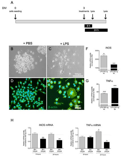Results of the LPS stimulation are reported in Figure 1B–G, where the morphology of the cells exposed to the control conditions (PBS; B) and LPS (C) in the bright field, as well as visualized by β-actin immunostaining (D and E, respectively), are shown. The cell cultures exposed to LPS displayed the typical cluster disaggregation, and single cells enlarged, retracted elongations, and assumed a phagocytic morphology. Regarding the pro-inflammatory markers evaluation, iNOS and TNF-α mRNA expression levels dramatically increased already 4 h after exposures, remaining up-regulated over the observational time (Figure 1F,G).