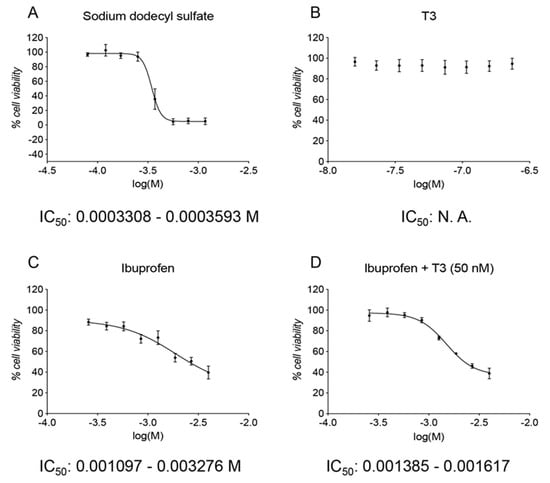 GLP toxicity study of the Ibu–T3 combination. The graphs show the cell viability normalized on the vehicle control group (100%) of cells exposed to different doses of sodium dodecyl sulfate (A), triiodothyronine (B), ibuprofen (C), and ibuprofen in the presence of a fixed dose of triiodothyronine (D). Concentrations on the x-axis are shown as the log of the Molarity; log(M). For each graph, the IC50 value is shown as Molarity (A,C,D) or as N. A. (not-applicable; (B)) if it was not possible to calculate the value.