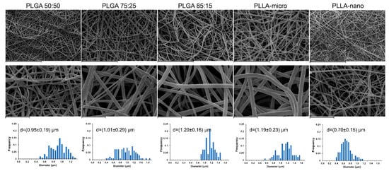 SEM images of the different electrospun scaffolds loaded with 5 wt% of Ibu at different magnifications and the corresponding fiber diameter distributions. Scale bars: 60 µm (first raw) and 10 µm (second raw).