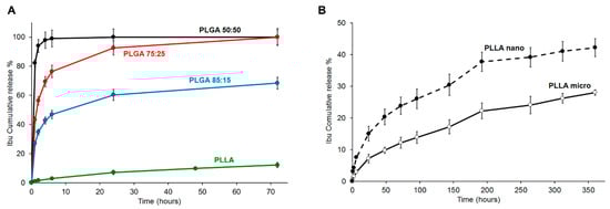 (A) Ibu release from scaffolds of different materials with similar fiber diameters: PLGA 50:50 (black), PLGA 75:25 (red), PLGA 85:15 (blue), and PLLA (green); (B) Ibu release from PLLA fibers with either micrometric (solid line) or nanometric (dot line) diameters.