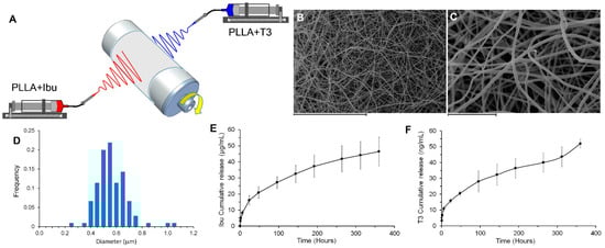 (A) Scheme of co-electrospinning instrumental set-up for the production of the dual-drug delivery electrospun system consisting of a fibrous scaffold composed of PLLA fibers loaded with Ibu at 5 wt% and of PLLA fibers loaded with T3 at 0.6 wt%. (B,C) SEM images of the delivery system at different magnifications (Scale bars: 60 µm (B) and 10 µm (C)); (D) fiber diameter distribution. (E) Ibu cumulative release in PBS over 400 h; (F) T3 cumulative release in PBS over 400 h.