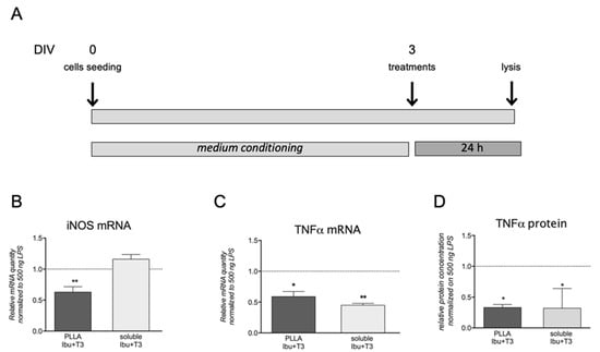 For this experiment, the conditioned culture media containing Ibu and T3 released from the PLLA scaffolds were prepared following the ISO 10993-12:2012 guidelines (Figure 6A). The treatments using the conditioned medium were demonstrated to be effective in counteracting LPS-induced up-regulation of iNOS and TNF-α mRNA expression level (3 DIV), with similar (TNF-α) or even higher (iNOS) efficacy of the drugs applied in the solution (Figure 6B,C). Additionally, PLLA + Ibu + T3-conditioned medium significantly reduced the TNF-α protein release with respect to PLLA alone, with the same efficacy of the two drugs applied in solution (Figure 6D).