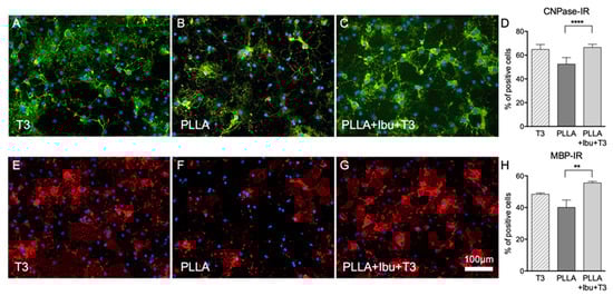The in vitro maturation of OPC was used to test the promyelinating properties of the drug-loaded scaffold. When exposed to inflammatory cytokines or LPS, OPC differentiation was blocked []. System maturation was induced by the culture medium conditioned by the PLLA + Ibu + T3 scaffold, as illustrated by the morphology (CNPase and MBP-positive cells, Figure 7A–C and Figure 7E–G, respectively) and counts of cells expressing mature oligodendrocytes markers (Figure 7D,H). The yield of maturation induced by the PLLA electrospun scaffold loaded with the two drugs is comparable to that of the positive control exposed to soluble T3.