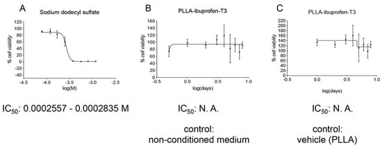 GLP toxicity in vitro evaluation of the delivery system. (A) The graph shows the cell viability normalized on the vehicle control group (100%) of cells exposed to different doses of sodium dodecyl sulfate. Concentrations on the x-axis are shown as the log of the Molarity; log(M). (B,C) The graphs show the cell viability normalized on the non-conditioned medium (100%; (B)) or the PLLA (vehicle)-conditioned medium (100%; (C)) of cells exposed to medium conditioned for different time lengths. Conditioning time on the x-axis is shown as the log of the conditioning days; log(days). For each graph, the IC50 value is shown as the Molarity, or as N. A. (non-applicable) if it was not possible to calculate the value.