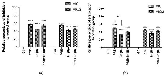 2.7. In Vitro Biofilm Inhibition and Eradication Activity of PRE, Zn (II), and PRE/Zn (II) Combination