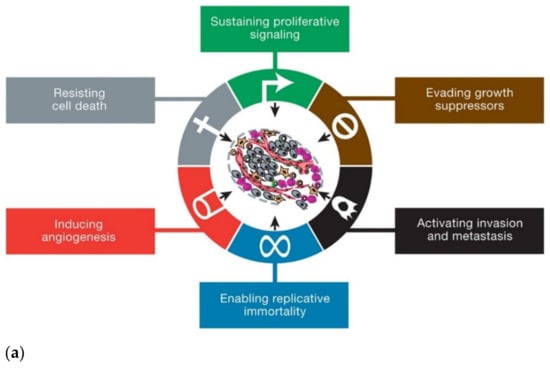 Cancer has been one of the most studied pathologies in modern history. Molecularly, it is interesting to mention that, as of the year 2000, it was proposed that neoplastic diseases shared six characteristics that constitute their basic organizing principles, thus providing a logical framework to understand them even when the diversity among this group of pathologies is enormous. These peculiarities were baptized as “The Six Hallmarks of Cancer” (Figure 2a), and the consensus reached at that moment was that as healthy cells evolve gradually to a cancerous state, they acquire a succession of these hallmark abilities that allow them to behave as a prototypical tumor. The acquisition of such malignant properties during multistep tumorigenesis has been concluded to be favored by two enabling characteristics; that is, phenomena that create the necessary breeding ground for cancer cells to start developing: genome instability and mutation, and tumor-promoting inflammation [33].