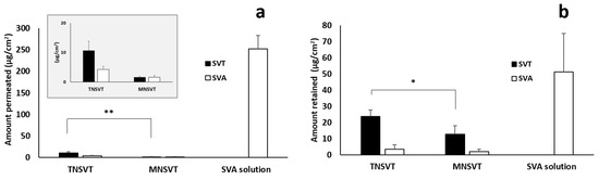 SVT (black) and SVA (white) permeated across (panel a) and retained (panel b) within porcine sclera after 48 h application of TNSVT, MNSVT or SVA solution. In panel (a), an insert depicting the magnification of TNSVT and MNSVT is shown (statistically difference: * p < 0.05, ** p < 0.01).
