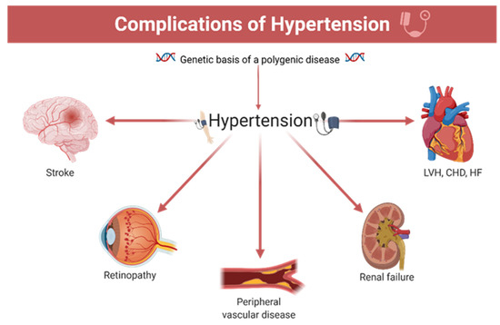 The main complications induced by hypertension (polygenic substrate): LVH—left ventricular hypertrophy; CHD—coronary heart disease; HF—heart failure.