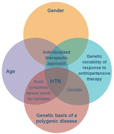 The main features and key factors for personalizing treatment in hypertension with a genetic- and gender-based substrate. HTN—hypertension; RAAS—renin–angiotensin–aldosterone system.