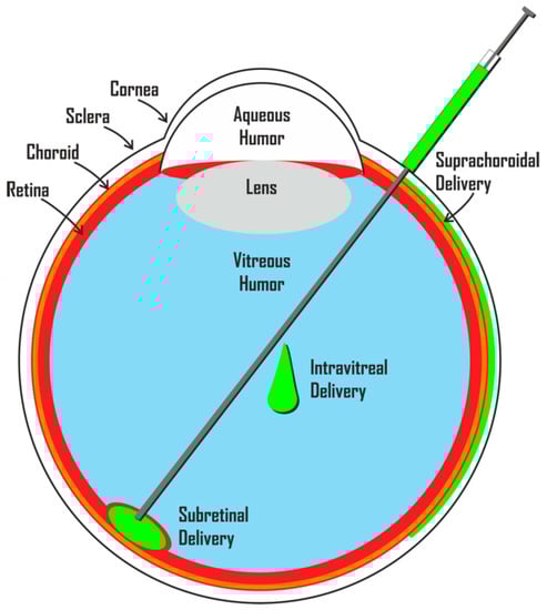 Routes of delivery (suprachoroidal, intravitreal and subretinal) are presented in Figure 1.