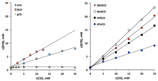 The proper choice of the most suitable CD to use for drug complexation is critical both to exploit at the best the benefits of the “drug-in CD-in liposome” strategy and to avoid possible problems of vesicle destabilization due to the CD presence [16,35,36,37]. Then, as a first step of this work, phase-solubility studies of BTB with a series of natural and derivative CDs were performed.