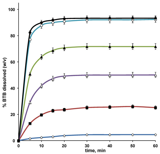 Dissolution profiles of BTB, both alone and from its various binary systems with the selected CD, were determined according to the dispersed amount method, following the experimental conditions used in previous studies, in order to obtain comparable results [29]. Experiments were performed at 37 ± 0.5 °C by adding 600 mg of drug or drug-equivalent to 100 mL of water, in a 300 mL beaker. The medium was stirred at 100 rpm by glass three bladed propeller. At fixed intervals, aliquots were withdrawn and BTB content was assayed as described above (see Section 2.2). The same volume of fresh medium was added to keep the volume of dissolution medium constant. A correction was made to take account of the cumulative dilution. Each test was repeated three times (coefficient of variation < 5%). Dissolution behavior was characterized through the percentage of BTB dissolved at 10 min, as an index of the dissolution rate, and the dissolution efficiency at 60 min, as an index of the process overall. Dissolution efficiency (DE) was calculated according to Khan [40].