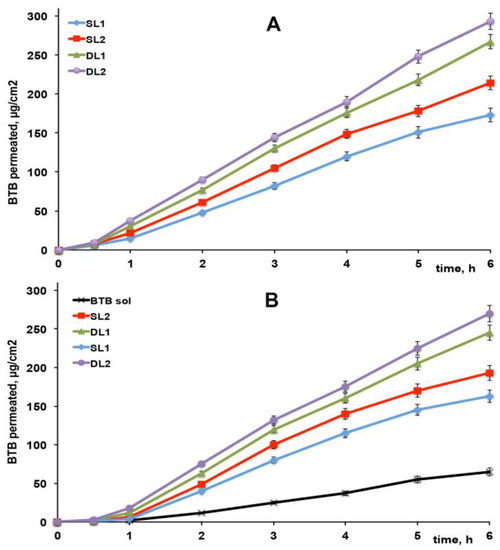 The drug apparent permeability coefficient (Kp), obtained by permeation studies across excised rabbit skin of BTB from the different liposomal dispersions either as such or formulated as Carbopol gel, are reported in Table 4; the related drug permeation profiles are shown in Figure 5A,B with the curve obtained from the drug solution in Carbopol gel.