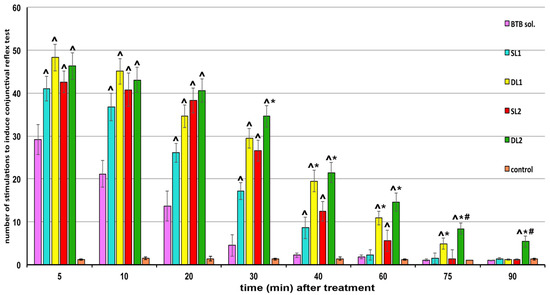Effect induced on the rabbit conjunctival reflex test by different Carbopol gel formulations containing 0.5% butamben (BTB) as hydroalcoholic solution or single-loaded (SL) or double-loaded (DL) liposomal formulations (see Table 3 for liposomal formulations composition). Six rabbits per group. Mean of six experiments. The control consisted of a Carbopol gel containing the corresponding formulation without drug. Note: ˆ p < 0.05 vs. drug solution; * p < 0.05 vs. SL formulation; # p < 0.05 vs. DL1 formulation.