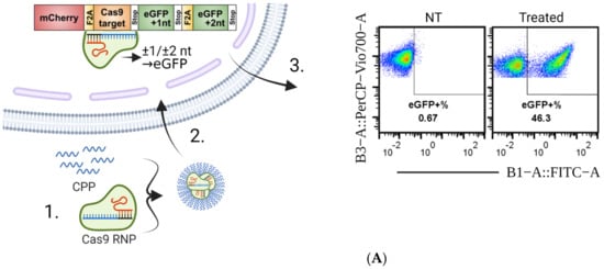 - Ramakrishna, S.; Kwaku Dad, A.B.; Beloor, J.; Gopalappa, R.; Lee, S.K.; Kim, H. Gene Disruption by Cell-Penetrating Peptide-Mediated Delivery of Cas9 Protein and Guide RNA. Genome Res. 2014, 24, 1020–1027. [Google Scholar] [CrossRef] [PubMed]