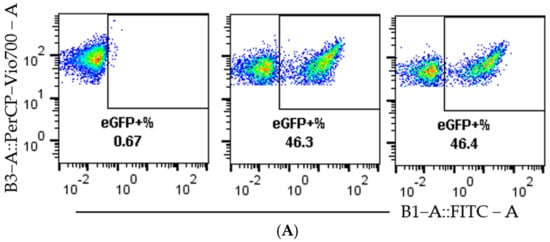 For Cas9 RNP gene-editing, cells were seeded one day before treatment (104 cells/well) in a 96-well plate. The cells were then treated with RNP-PF14 and incubated in full media without a media change for 3 days to enable robust eGFP expression. The cells were prepared for flow cytometry as described above for AB-treated cells. eGFP was detected in channel B1 (525/50 nm), mCherry (mC) in B3 (655–730 nm), and DAPI in channel V1 (450/50 nm). A minimum of 2000 cells per well were analyzed. The cells were gated in the order of cells/viable/mC+/eGFP+. (Supplementary Materials Figure S3). Data were analyzed using FlowJo 10.6.2 (FlowJo, LLC) software.