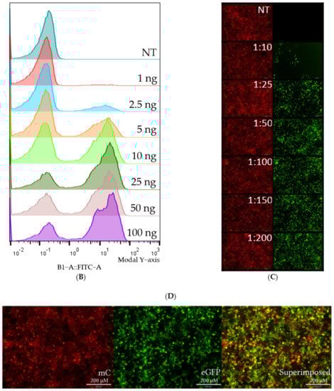 Visualization of representative flow cytometry data and microscopy. HEK293T SL cells were used for Figure 3A–D. (A) Dot plots of mC (y-axis) plotted against eGFP (x-axis). In the order left to right, non-treated, 10 ng Cas9 RNP-PF14 (MR 1:100, RNP: PF14), and RNAiMAX 10 ng Cas9 RNP. (B) Histogram visualizing the eGFP signal in RNP-PF14 treated cells, added text displays Cas9 (ng)/well. (C,D) Fluorescence microscopy (10×) displaying the mC and eGFP of cells treated with Cas9 RNP-PF14, 50 ng/well in an increasing MR ratio (C) or 100 ng Cas9/well (MR 1:100) (D).