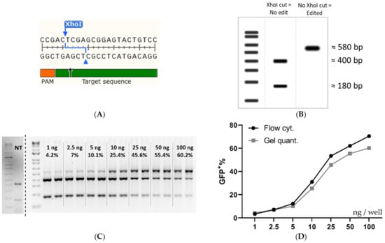 Validation of the flow cytometry data by RFLP analysis. (A) The DNA sequence at the Cas9 cleavage site in SL cells. (B) Expected RFLP outcome at 0 and 100% XhoI disruption. (C) An agarose gel was used for intensity quantification for RFLP analysis of HEK293T SL cells treated with increasing amounts of RNP: PF14 (MR 1:100). The dose of Cas9 per well (ng) and the mean quantified editing is superimposed on the gel image. (D) Comparison of a dose titration between flow cytometry quantification and RFLP quantification. Linear y-axis against log10 x-axis. Flow cytometry quantification was done in triplicate, n = 1. Gel quantification was done in duplicate, n = 1. The cells in (C,D) were HEK293T SL cells treated with an increasing dose of Cas9/well (MR 1:100 RNP: PF14, formulated in DMEM/PVA-PEG (5 w/v%)).