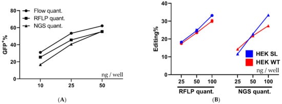 Quantification by RFLP is not always 100% accurate, therefore NGS was carried out on the same DNA extracted for gel quantification. The editing rates reported by flow cytometry, RFLP, and NGS were surprisingly similar, although, the flow data may overestimate the editing slightly. That being said, the samples follow the same trend regardless of the analysis method, and hence the flow cytometric readout can be utilized for screening purposes without further confirmation (Figure 5A).