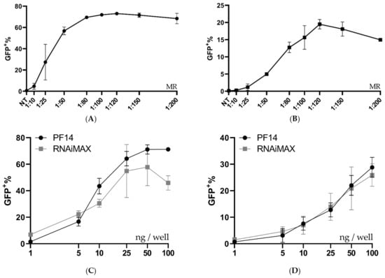 Ratio and dose testing in MDA-MB-231 SL and MCF-7 SL. (A,B) Ratio optimization of Cas9 RNP-PF14 (50 ng Cas9/well, formulated in DMEM/PVA-PEG (2.5 w/v%)) given to MDA SL and MCF SL cells. Means of n = 2. (C,D) Dose titration of RNP-PF14 (MR 1:150 RNP to PF14 formulated in DMEM/PVA-PEG (2.5 w/v%)) and RNAiMAX on (C) MDA SL and (D) MCF SL cells, respectively. Linear y-axis against log10 x-axis. n = 3 for PF14-RNP and n = 2 for RNAiMAX.