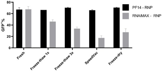 PF14 complexes can withstand various storage conditions, thus the storage properties of our Cas9 RNP-PF14 nanoparticles were tested []. The RNP-PF14 nanoparticles were first complexed as previously outlined and then frozen for freeze-thawing experiments, freeze-dried, or vacuum concentrated (SpeedVac) without being frozen. The formed nanoparticles not only survived freeze-thaw cycles, SpeedVac, and freeze-drying, but they were equally active after storage (Figure 7. This enables easy handling and usage. RNAiMAX on the other hand has a reduced transfection ability after any of the storage techniques tested.