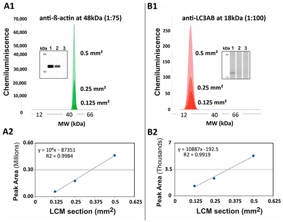 Cap-IA results of anti-β-actin (1:75) and anti-LC3AB (1:100) antibodies with three different LCM samples (0.5 mm2, 0.25 mm2, and 0.125 mm2) of rat kidney tissue. (A1) Electropherogram representation of cap-IA signals and gel-like image representation of cap-IA signals. Lane 1: 0.5 mm2; lane 2: 0.25 mm2; lane 3: 0.125 mm2 using anti-β-actin antibody. (B1) Electropherograms representation of cap-IA signals and gel-like image representation of cap-IA signals. Lane 1: 0.5 mm2; lane 2: 0.25 mm2; lane 3: 0.125 mm2 using anti-LC3 antibody. (A2,B2) Linear curve of areas under peaks in cap-IA (y-axis) versus loading protein amounts (x-axis) relationship showing decreasing intensities of bands or peak areas with a decreasing area of LCM samples.
