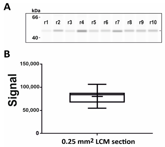 Reproducibility of LCM-cap-IA integration: Signal response of β-actin on 0.25 mm2 dissected LCM samples from rat kidney tissues with 10 µm thickness: (A) Gel-like image representation of cap-IA signals, (B) Data analysis of the area under the curve from 10 technical replicates, processed separately. Data were analyzed by box and whisker graph.