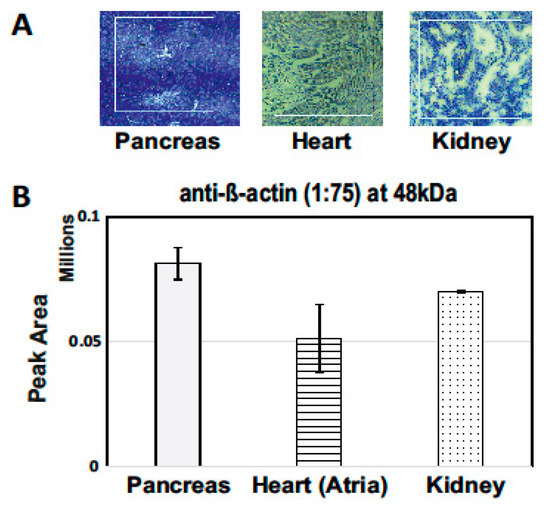 To validate that the approach could be used with the tissues of different heterogeneity, the β-actin signal response from 0.25 mm2 LCM sections (10 µm thickness) from the kidney, heart, and pancreas of a rat was examined and compared (Figure 4). The highest β-actin signal response was observed from the pancreas and the lowest signal from heart tissue. The difference in the signal response was due to different heterogeneity among tissues. This clearly shows that prior optimization is required for using LCM-cap-IA integration (Figure 4).