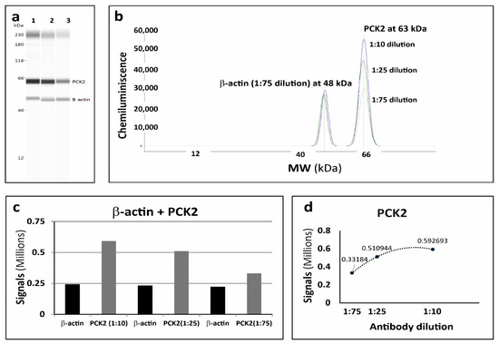Multiplexing results of anti-PCK2 with anti-β-actin on capillary western blot. Three different dilutions of anti-PCK2 (1:10; 1:25; 1:75) were used with a fixed dilution of anti-β-actin (1:75) on a 0.5 mm2 LCM section of rat kidney tissue, with a thickness of 10 μm. (a) Gel-like image representation of cap-IA signals. Lane 1: anti-PCK2 dilution 1:10, lane 2: anti-PCK2 dilution 1:25, lane 3: anti-PCK2 dilution 1:75. (b) Electropherograms representation of cap-IA signals. (c,d) Data analysis of the area under the curve to understand the best dilution of anti-PCK2 for multiplexing.