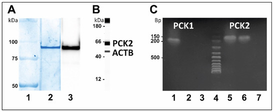 The commercially available recombinant PCK2 corresponding to the amino acids 1–640 of human PCK2 full-length was purchased and used to confirm the specificity of anti-PCK2 antibodies in conventional WB analysis. A single immunogenic band of PKC2 at 96 kDa was observed as mentioned in the datasheet of recombinant PCK2 (Figure 6A). The higher molecular weight of recombinant PCK2 was due to GST-tag at N-terminal but PCK2 corresponding to the amino acids 1–640 of human PCK2 full-length. In the capillary Western blot of dissected Langerhans islets, an immunogenic band of PCK2 at 63 kDa was visible using similar antiPCK2 antibodies (Figure 6A). Moreover, the presence of PCK2 was further validated by RT-qPCR analysis of RNA isolated from Langerhans islets. Product of appropriate size was obtained with primer pair specific to PCK2 mRNA. Additionally, RT-qPCR reaction with primer pair corresponding to PCK1 mRNA was done, in order to prove the production of this enzyme by the obtained cells. No specific product was detected in the LCM sample of the Langerhans islets with primer pair for PCK1 (Figure 6C).