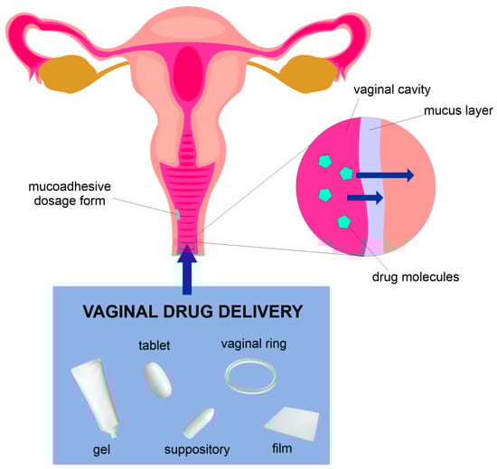 Once the formulation reaches the vaginal mucosa, it can release the drug into the vaginal cavity or on the surface of the vaginal mucosa. Depending on the type of formulation and properties of the active compound, systemic activity can also be achieved as a result of permeation to the vaginal vascular system [68,69]. According to the studies presented by van der Bijl &van Eyk [70], the vaginal mucosa reveals a very similar permeability to water as buccal mucosa, but in comparison to the intestinal and colonic mucosa, its permeability is higher. In addition, it is more permeable for various drugs than intestinal and colonic mucosae, even in the case of compounds with amolecular weight higher than 300 kDa [70,71,72]. A scheme depicting the vaginal route is presented in Figure 1.