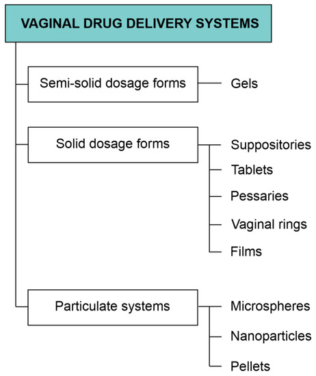 Due to the fact that the drug delivered through the vaginal route has to overcome physiological and anatomical barriers to achieve a localized action or reach the systemic circulation, it is important for the drug form to have specific properties. Those are, for example, a long residence time at the site of action, proper parameters of drug release, and adhesion to the mucosa. Mucoadhesive formulations based on the appropriate polymers are particularly interesting and seem to be the most promising in the case of vaginal drug delivery. This group comprises conventional drug forms, e.g., ointments, creams, tablets, and suppositories, as well as newly discovered rings, nanoparticles, or films [187]. All listed drug forms are meant to optimize the action of the drugs administered into the vagina and will be described in detail in this chapter. The dosage form classification applied in this review is presented in Figure 2.