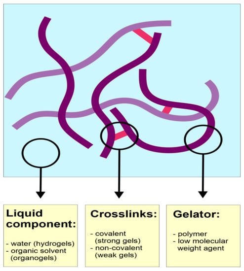 Even though gels frequently occur in numerous scientific and non-scientific areas, the definition of the gel is difficult, and there are several different approaches to the description of these systems. According to Almdal et al. [195], gels are defined as soft, solid-like, or solid material consisting of two or more components. One of the components is liquid and occurs in a significantly higher amount than the other one. The proposed definition also emphasizes the specific rheological properties of gels, which is storage modulus (G’) significantly higher than loss modulus (G”) and exhibiting prolonged plateau. It is also noteworthy that heterogenous materials are excluded from this definition. According to Rogovina et al. [196], the gel is an elastic solid containing two or more components. One of the components is liquid, and the other one forms a three-dimensional network. The type of bonds occurring in the network determines gel type. Chemical gels are bonded with strong covalent bonds, while in physical ones, mostly hydrogen bonds are present. The network-forming component is usually a polymer; however, there is also a possibility to obtain gel with the use of low molecular weight gelators [197]. Considering the type of liquid component, gels can be classified as hydrogels when they are water-based or organogels when the liquid component is non-aqueous. The general classification of gels according to different criteria is depicted in Figure 3. It is noteworthy that gels applied in vaginal drug delivery are mostly weak physical hydrogels obtained with polymer gelling agents.