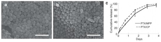 Characterization of PTX/PLGA nanoparticles in vitro. SEM images of (a) PTX/MPP and (b) PTX/CP; scale bar represents 1μm. (c) Cumulative in vitro release of PTX from PTX/PLGA nanoparticles over time [247].