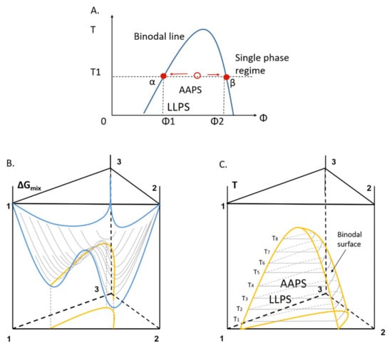 In the ASD system, different amorphous polymeric or small molecular excipients are utilized to stabilize the amorphous drug during the storage as well as to enhance the solubility and dissolution rate of the drug in solution [21,22,23,24]. While amorphous drug molecules are considered to be homogeneously dispersed within the excipients in an ideal ASD system, an amorphous-amorphous phase separation (AAPS) phenomenon is often observed during the manufacturing or storage due to the imperfect miscibility of drug and excipients [29,75,76,77]. The AAPS phenomenon can be normally interpreted by the schematic phase diagram of ASD illustrated in Figure 2A, where the solid blue line indicates the binodal line. At this binodal line, the single homogeneous ASD phase splits into drug-rich and drug-lean amorphous phases. Theoretically, the drug volume fractions of these two phases are expected to be Φ1 and Φ2 at the specific temperature T1 under the equilibrium state (Figure 2A). However, in most ASD systems, particularly those with polymers as the excipients, the restricted mobility of polymer chains hinders the system to reach the equilibrium state. Indeed, the AAPS phenomenon is more pronounced at lower amounts of excipient or at a temperature range above the glass transition temperature of the system, where the mobility of drug and excipient molecules is higher [75].