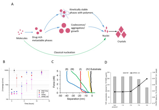 (A) Schematic illustration of the possible nucleation pathways (classical or non-classical) of drug in a solution. (B) Danazol Z—average diameters over time for systems with or without polymers. Reproduced with permission from [23], American Chemical Society, 2014. (C) Four schematic AFM force-distance curves for probucol (PBC)-HPMC-dodecyl sulfate systems over the storage time, (I) 1 d, (II) 2 d, (III) 4d, and (IV) 7d. Reproduced with permission from [106], American Chemical Society, 2015. (D) Solution 1H NMR detectable nifedipine and HPMCAS concentration over time. Reproduced with permission from [107], American Chemical Society, 2017.