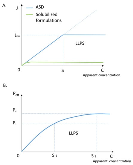 In this review, we highlight: (i) the thermodynamics and kinetics associated with the formation of drug-rich phases from the dissolution (Section 2); (ii) in vitro permeability enhancement and in vivo bioavailability enhancement in the context of ASD formulation (Section 3). Other aspects associated with the drug-rich phases, such as the dissolution model [58], the liquid-liquid phase separation (LLPS) identification and screening technique [59], and the impact of surfactants and polymers in the nanodroplet uptake [60,61], can be found in other excellent studies in the literature.