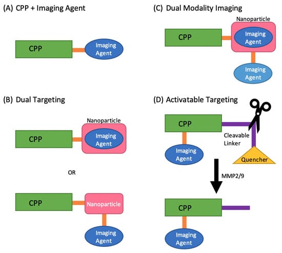(A) CPP + imaging agent directly combines a specific or non-specific CPP with an imaging agent via a linker and/or conjugation. (B) Dual targeting combines a CPP with another target-specific component, such as a nanoparticle, via a linker and/or conjugation. An imaging agent can then be linked to the combination or embedded within a nanoparticle. (C) Dual-modality imaging combines a CPP with two imaging agents, allowing for different imaging methods. In this case, the imaging agents are attached via a linker and embedded within a nanoparticle. (D) Activatable targeting combines CPP and an imaging agent with a MMP2/9-cleavable linker and quencher for the imaging agent. The CPP can only be imaged when MMP2/9 are present to cleave off the quencher.