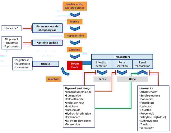 Schematic routes of urate production and disposition. The boxes list drugs that affect urate homeostasis and are discussed in this review. Experimental drugs are marked with an asterisk (*). Red bars (inhibition) and the green arrow (stimulation) indicate the main mechanism by which drugs modulate serum urate levels.
